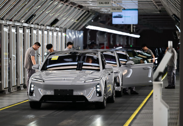 2025年7月1日在合肥市新橋智能電動汽車產(chǎn)業(yè)園蔚來第二工廠拍攝的新能源汽車生產(chǎn)線。新華社記者 周牧 攝